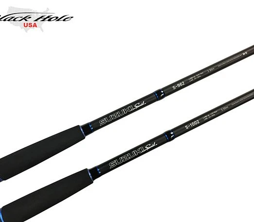 Black Hole USA Suzuki Special Surf Spinning Rods are available in 9’6″ and 10′ models. They are black with blue accents. We like pairing it with a Van Staal VR50, b chameleon finish will turn heads on the beach. They are 2-piece with a 50/50 split.