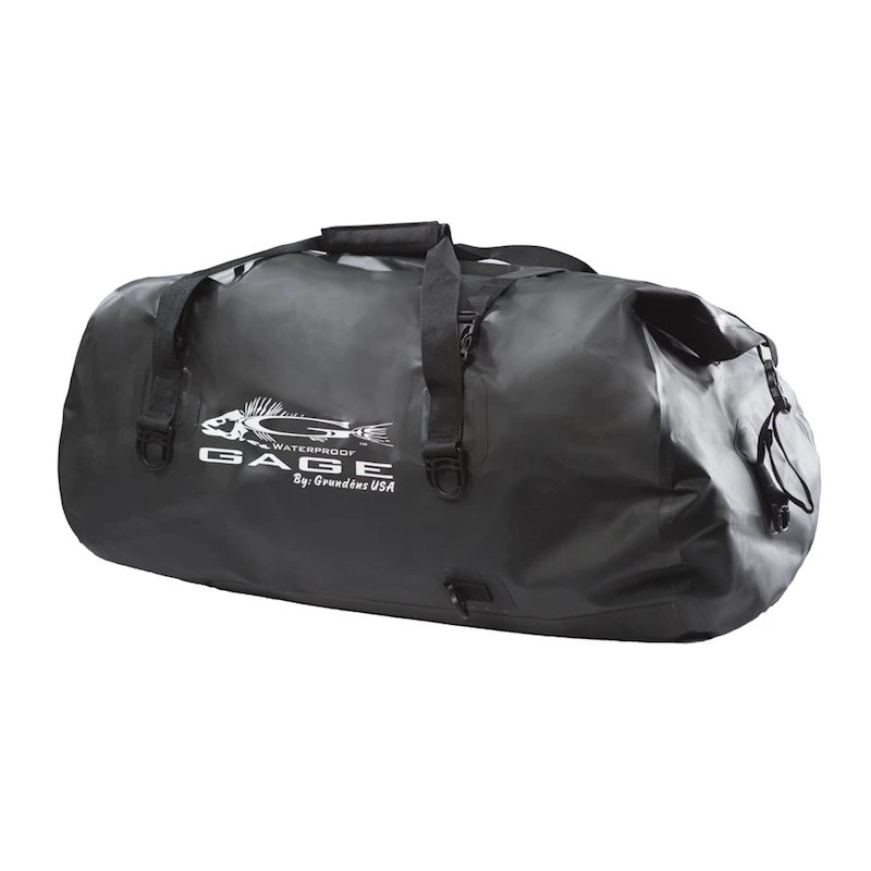 The Grundens GAGE 105 Liter Shackelton Waterproof Duffel Bag is perfect for your next fishing adventure! 100% waterproof, this bag has a ton of room for all the gear you want to keep dry! Fill it with fishing tackle, clothing, electronics and anything else that you want to keep bone dry. The Shackelton is constructed of 500d PVC tarpaulin fabric and features a roll top closure to ensure water stays on the outside. Use the built in compression straps to make the bag any size you like. It even converts to a backpack with hidden straps on the bottom! The seams on the Grundens GAGE 105 Liter Shackelton Waterproof Duffel Bag are radio frequency welded to ensure that they never let moisture in!Â