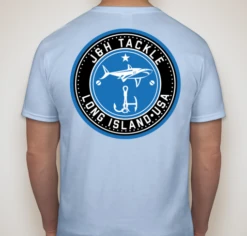 The J&H Tackle Circle Logo T-Shirt is one of our nicest shirts yet! Customers have been asking us for a shirt with a logo on the front left chest and a bigger version on the back and we have delivered. Built on an ultra-soft 100% cotton tee, the J&H Tackle Circle Logo is screened on the front and back. It features a shark, the J&H Hooks logo and a shoutout to our home base, Long Island, USA. If you like our shop or enjoy watching our videos, a great way to support us is to buy and proudly wear this shirt on your next fishing adventure, or around town. The J&H Tackle Circle Logo T-Shirt is available in sizes M-2XL in light blue and navy.