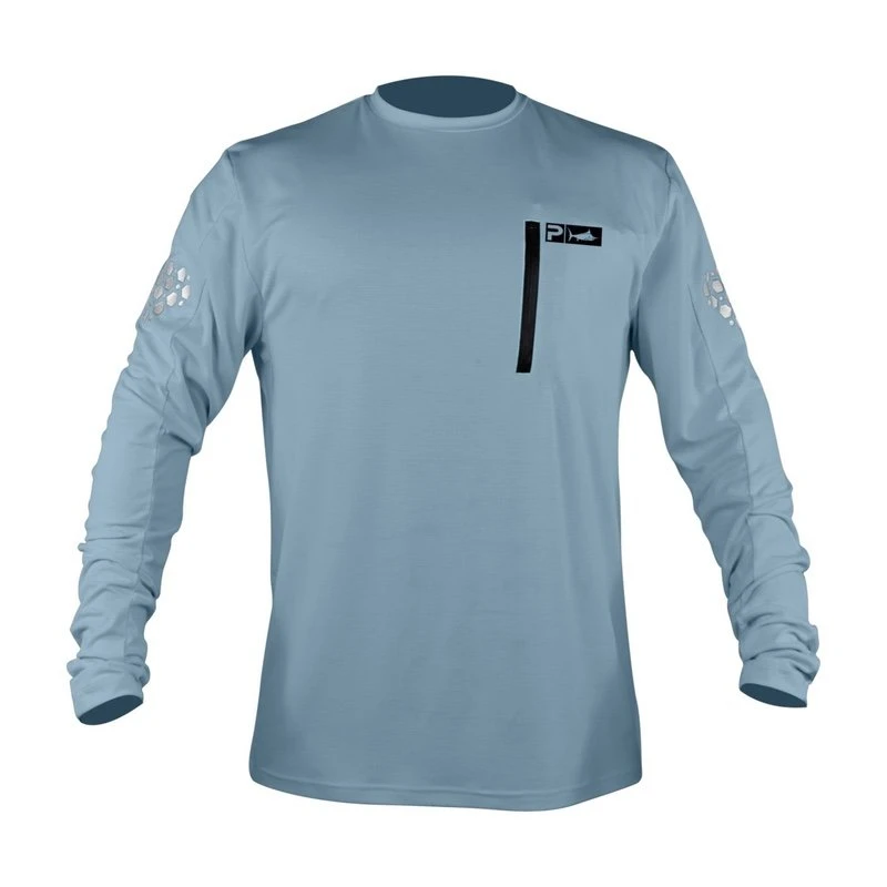 Pelagic Aeroflex Tek Long Sleeve Performance Shirts are available in several sizes in slate (blue) and optic white.