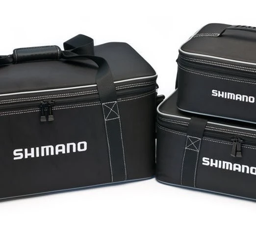 Shimano Bhaltair Reel Bags are available in three sizes. Bags are black with white and silver accents.